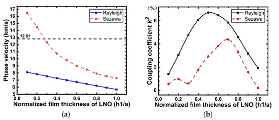 For a unit model with fixed 1.5 μm LiNbO3 layer thickness, the phase velocities of the Rayleigh mode and Sezawa mode drop with increasing electrode thickness, while exhibits a rising trend (plotted in Figure 9).