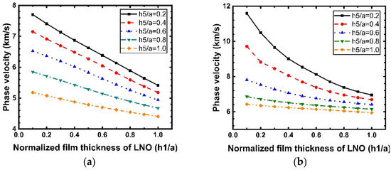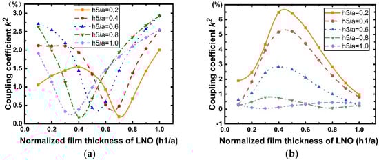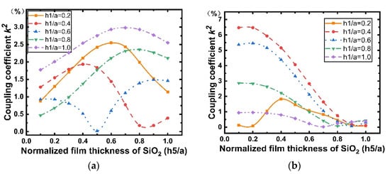 Figure 11 shows the dispersion curves of the phase velocity calculated for the Rayleigh and Sezawa modes with when the values of are 0.2, 0.4, 0.6, 0.8, and 1. According to Figure 11a,b, we can observe that the velocities of the Rayleigh and Sezawa waves decrease as and increase. This behavior is explained by the fact that the elastic velocity in the structure is close to that of the diamond substrate when the LiNbO3 and SiO2 layers are very thin, and these values decrease to reach those of the piezoelectric film. In the Sezawa mode, a high of 11.59 km/s could be obtained at = 0.1 in the Sezawa mode; as , a higher will result in a higher frequency, which is beneficial for high-frequency device fabrication and performance. Figure 12 shows the calculated LiNbO3 thickness dependence of . It is interesting that, in the Rayleigh wave mode (Figure 12a), shows the opposite trend and decreases dramatically compared with that for the structure without SiO2. In contrast, the Sezawa mode (Figure 12b) presents the same trend as before, and the value of increases significantly when the SiO2 thickness is small. In particular, when = 0.4, the maximum coupling coefficient of this mode is 6.47%.