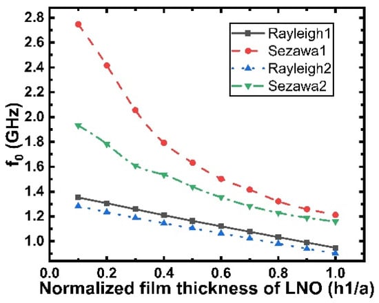 Plot of central frequency versus normalized LiNbO3 thickness (). Rayleigh1, Sezawa1, and Rayleigh2, Sezawa2 are the two SAW modes before and after the layer thickness = 0.1 is added, respectively.