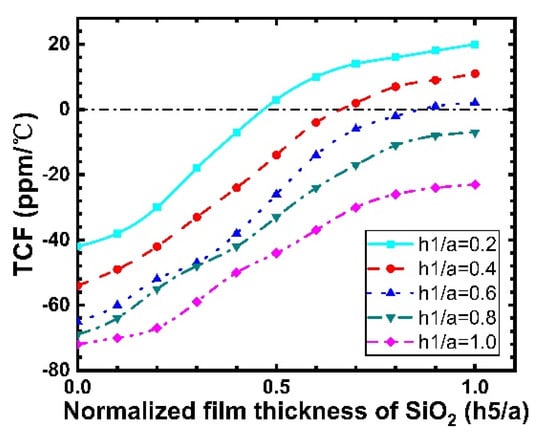 The change in material parameters leads to a change in the SAW velocity, and the TCF is obtained using Equation (8). Figure 16 shows the TCF of a Rayleigh wave propagating along SiO2/IDT/LiNbO3/diamond/Si versus the normalized thickness of the SiO2 layer with different thicknesses of the LiNbO3 layer. For 0.8 and 1, a negative value of TCF is observed for all values of SiO2 layer thickness. In the case of , 0.4, and 0.6, a positive value occurs for a large , and a TCF of zero is obtained. Note that the TCF of LiNbO3 single crystal reaches −75 ppm/°C, and it is apparent that the existence of the SiO2 film caused an improvement in the TCF. Usually, as shown in Figure 16, for a better TCF, a thicker SiO2 overcoat is preferred.
