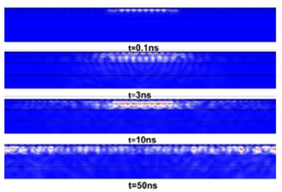 The transient simulation was run for 50 ns with the timestep of 0.1 ns. Figure 18 shows the propagation characteristics of SAWs when the loading of the SAW filter is the harmonic electric voltage on the input IDT with an amplitude of 10 V and frequency equal to the eigenfrequency computed in the modal analysis, MHz. As shown in Figure 18, the waves propagate on the surface of the filter, but some of them also propagate into the substrate, and at approximately t = 3 ns, the SAWs reach the output electrode.