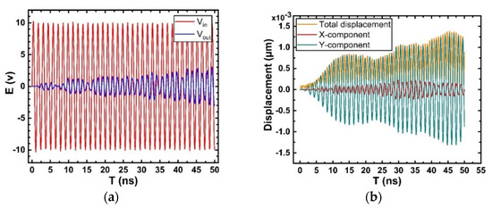 Results of transient analysis. (a) Input and output voltage on IDT; (b) Simulation diagram of the total surface displacement of the model and its X-Y component displacement.