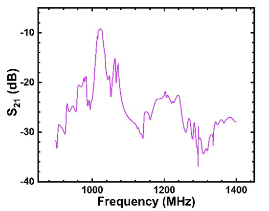 Figure 20 shows the S21 characteristics in the frequency domain analysis of the filter designed with the SiO2/IDT/LiNbO3/diamond/Si structure. It can be seen that the transmission characteristics of the device are the best at the center frequency MHz, and the minimum insertion loss is less than 10 dB. However, for the low-loss filter, there was still a large insertion loss. This is because this design parameter cannot obtain the optimal , which leads to excessive insertion loss, and the insertion loss can be further reduced using the geometric result of a high .
