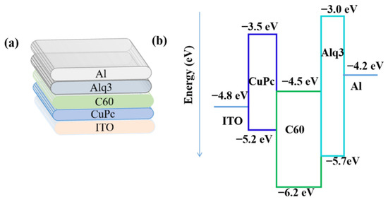The device structure (a) and energy level (b) with ITO/CuPc (20 nm)/C60 (55 nm)/Alq3 (6 nm)/Al (100 nm).