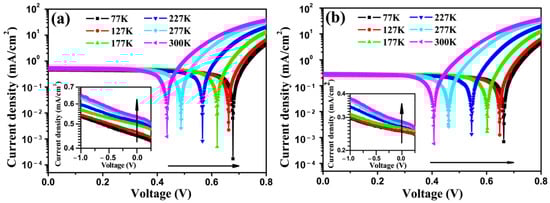 As shown in both Figure 2a,b, the Voc decreases while the Jsc increases with the increasing temperature, and this is consistent with reported works [26]. Note that, Voc at 77 K is about 0.67 V, which is very close to the energy difference (0.7 eV) between the highest occupied molecular orbital (HOMO) of CuPc (5.2 eV) and the lowest unoccupied molecular orbital (LUMO) of C60 (4.5 eV) [27]. However, this is obviously larger than the work-function difference (0.52 eV) between the used electrodes (oxygen plasma treated ITO is around 4.8 eV while Al is 4.28 eV) [28]. The above observation confirmed that Voc is determined by the energy difference between donor and acceptor rather than the work function difference of the two electrodes [16,29].