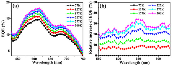 (a) EQE of the developed device at various temperatures. (b) Relative variation of EQE for different temperatures with the EQE at 77 K being chosen as reference.