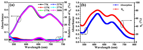 To investigate the influence of temperature on , the absorption spectra of CuPc film (~50 nm) and the relative changes of absorption efficeicy have been recorded at different temperatures, which is shown in Figure S2. As reported in Figure 4a, the absorption variation is negligible in the range of 77–300 K. To the best of our knowledge, the temperature dependence of the absorption spectra of CuPc film has not been reported previously. Figure S3 shows the maximum relative absorbance (with the absorbance at 77 K chosen as reference) change at 300 K is less than 2%, and this occurs at 620 nm and 700 nm, which are the peak absorption wavelengths of CuPc. A simple calculation shows that 2% change of absorbance induces less than 3% change in .