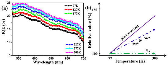 (a) Calculated IQE spectra of the developed device at different temperatures; (b) Schematic drawing showing absorption efficiency (, exciton diffusion () and dissociation efficiency (), carrier mobility and photocurrent trends versus temperature. 77 K was chosen as the reference temperature.