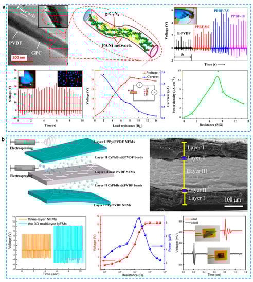 (a) Polyaniline-graphitic carbon Nitride nanosheet composite materials with embedded PVDF nanofibers for piezoelectric energy conversion, including TEM morphology, Piezoelectric voltage output for different samples [63]; (b) Electrospun/electrosprayed PVDF-based nanofiber and bead multilayer assembly with increased piezoelectricity and high sensitivity, including schematic of the 3D multilayer, cross-section SEM image and generated open-circuit output voltage and short-circuit current [30].