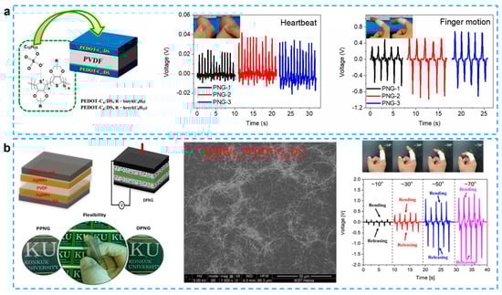 (a) Schematic illustration of sandwich structure with PEDOT-Cx:DS. The generated output voltage performance from the PNGs used for heartbeat monitoring system attached to wrist and human motion monitoring system attached to index finger [59]. (b) Schematics of DPNG, Photographs of transparency of AgNWs film, Flexible PVDF based hybrid electrode PNG and transparency of hybrid electrode, cross-section SEM images of DPNG, Performance of flexible DPNG under index finger movement [26].