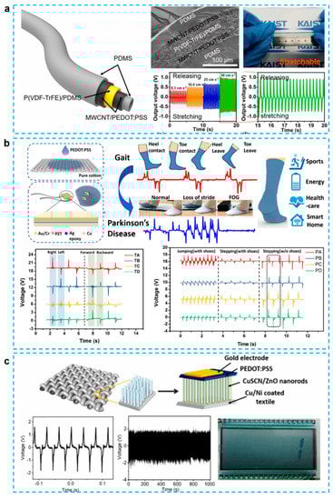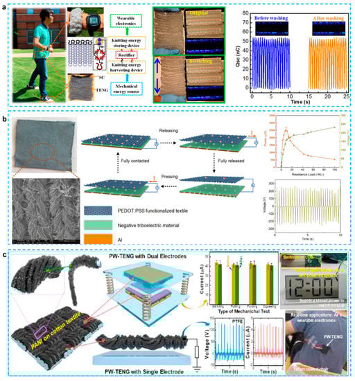 (a) A highly stretchable and washable all-yarn-based self-charging knitting power textile composed of fiber triboelectric nanogenerators [105]. (b) Multi-functional and PEDOT:PSS based TENG was made from the stretchable smart textiles to harvest energy from various body motions [132]. (c) Wearable and durable triboelectric nanogenerators via polyaniline coated cotton textiles as a movement sensor and self-powered system [33].