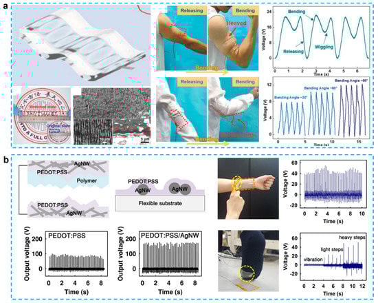 (a) A wrinkled PEDOT:PSS film-based stretchable and transparent triboelectric nanogenerator for wearable energy harvesters and active motion sensors [107]. (b) Transparent and flexible high power triboelectric nanogenerator with metallic nanowire-embedded tribonegative conducting polymer [101].
