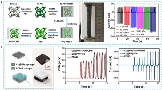 (a) Stretchable 3D polymer for simultaneously mechanical energy harvesting and biomimetic force sensing [29]. (b) Elastic Cu@PPy sponge for hybrid device with energy conversion and storage [27].