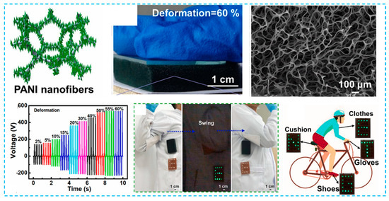 The voltage output of a single-electrode TENG constructed by merging PDMS friction layer within 3D PPy network was three times greater than that of typical TENGs [29]. As shown in Figure 9a, the friction between the porous PPy and the porous PDMS in the TENG causes electron injection from the PPys to the PDMS. When the force is removed, the neighboring PPy electrodes produce a positive charge. They flow from PPy to ground until they reach equilibrium. Combining it with PDMS and porous PPy not only greatly enhances the electric output signals (11.3 mA/m2), but also makes it exceedingly flexible and stretchable (310% length increase). Figure 9b exhibited a copper sponge-based triboelectric nanogenerators, which has single electrode with varying the PPy content and hybridization of Cu@PPy with PDMS sponge to turn the voltage outputs [27]. The average voltage peak of 50 V, current of 400 nA, and charge of 20 nC were obtained, respectively. The practicality and accessibility of producing metal sponge-based elastic TENG were established by these findings. By using a simple high-temperature carbonization method, Zhao and coworkers were able to construct TENGs made of melamine foam [120]. This can help spread the organic electralyte into the electrons using the results of hydrophobial carbonized melamine foams, which include uniform and micrometer pores. It was also shown that pulsed energy was stored with CMF-based HF-SCs at frequencies ranging from 40 to 1350 Hz. The energy utilization efficiency of the CMF-based CFS was raised by 20.3 percent at 1350 Hz when compared to conventionally used carbon-based SCs (AC-SCs), showing that HF-SCs are more beneficial than conventional AC-SCs in storing pulse energy of variable frequencies. However, the above work did not show the energy storage application usage in relation to human acitvity. Very recently, Liu et al. further developed the TENG using the combination of PANI nanofibers with elastic sponge to act as electrode [104]. As illustrated in Figure 10, aniline was coated using a dilute chemical polymerization process on the surface of a sponge with a 3D reticular structure, which enables it to create around 60% elastic deformation. When compression deformation is increased from 2% to 60%, the voltage increases from 142 V to 520 V. For example, it can be seen that the electric energy generated by the ES-TENG can power the LED lights during the arm swing, suggesting that the ES-TENG can gather random-rotation, mechanical energy from the environment. Due to the flexibility of ES-TENG, it may be utilized on a variety of flexible object surfaces, including gloves, clothing, pillows, and shoes, to gather irregular and random mechanical energy.