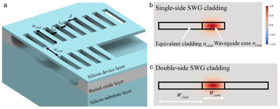 Specifically, the waveguide structure consisted of a 1.4 μm wide waveguide core (wcore = 1.4 μm) and lateral SWG claddings with a width of 4 μm (wclad = 4 μm). The SWG claddings comprised air holes of 0.4 μm in length (lair) and Si stripes of 0.2 μm in length (lair) in a period of 0.6 μm (Λ = lair + lair). The proposed waveguide was designed to be single mode in TE polarization. Using such a waveguide design, the Bragg reflection can be avoided for the mode propagation and the lateral mode leakage can be reduced, thus enabling low-loss propagation. As shown in Figure 1a, the double-side SWG claddings can be converted to single-side claddings to realize the movable MEMS features. Here, we simulated the mode profile at the wavelength of 4 μm using Lumerical FDE solver. Based on the simulation results, a large overlap of 98.3% between the optical mode on the suspended waveguides with double-side cladding and single-side cladding was found (see Figure 1b,c), which guaranteed the low-loss mode conversion on the interface.