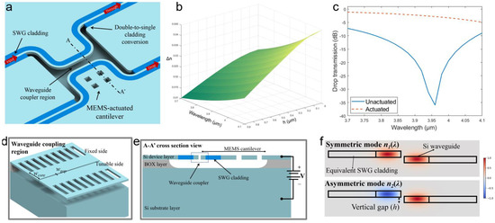 where D is the drop ratio, T is the through ratio and L is the coupling length. The maximum vertical gap of the waveguide coupler can be estimated to be 0.9 μm based on the MEMS cantilever electrostatic pull-in model and the 2 μm BOX thickness [50]. Lπ(λ), which is defined as the coupling length required for a complete power transfer from one waveguide to the other, is critical for the waveguide coupler performance. Based on our simulation results and Equation (1), the Lπ at the wavelength of 3.95 μm was found to be 57 μm. The simulated drop transmission spectrum is shown in Figure 1c. With an MEMS-actuated vertical gap of 0.9 μm (Figure 1c), the effective tuning of Δn could reach 0.0224, which potentially achieved a reconfigurable optical power splitter and switch on the proposed waveguide platform.