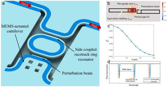 Furthermore, we propose a reconfigurable ring resonator concept, which shows the versatile design potential of the proposed reconfigurable waveguide platform. As shown in Figure 3a, the reconfigurable device consisted of a side-coupled racetrack ring resonator and a tunable perturbation beam with an MEMS actuator. The double-side SWG cladding was converted to a single-side to allow coupling between the bus waveguide and ring resonator. The width of the bus waveguide in the coupling region was tapered to the same as the waveguide width of the ring resonator, which was 1.3 μm. The tapered design can enhance the coupling condition. The ring resonator was connected to a fixed Si slab via the SWG claddings, which followed the same SWG design as mentioned above. On the other side, a perturbation beam with a width of 0.6 μm was placed close to the ring resonator. The width of the perturbation beam was designed such that it did not support any propagation mode. As a result, the perturbation beam only changed the field profile and effective index of the waveguide mode in the ring resonator at the affected region. With the vertical actuation of the perturbation beam, it induced a phase shift or an effective length change to the ring resonator, thus tuning the spectral characteristics of the resonance. To validate the proposed reconfiguration mechanism, we firstly designed a ring resonator with 30 nm free spectra range (FSR). From the literature [51], the FSR of a ring resonator can be given by