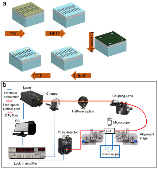 The experimental testing setup is depicted in Figure 4b. A quantum cascaded laser (Daylight, MIRcat-1200, San Diego, CA, USA) was used as the MIR light source. A mechanical disk chopper (Stanford Research SR540) was placed in the free-space light path and connected to the lock-in amplifier (SR830) as the reference frequency. After the chopper, a half-wave plate (Thorlabs WPLQ05M-4000, Newton, NJ, USA) was used to adjust the polarization. Through the ZnSe lens, the free-space laser beam was focused on a ZrF4 fiber. We used the fiber-to-chip grating couplers to input the light and collect the output. The fiber ends were mounted on a pair of mechanical positioners at a 10° tilt. Using the vertical microscope, we achieved alignment between fiber ends and grating couplers. The output light was sent to a photodetector (Thorlabs PDA20H) that was connected to the lock-in amplifier as an input. The bias voltage was applied to the on-chip device via the microprobe positioners. The lock-in amplifier was used to reduce environmental noise in the testing system.