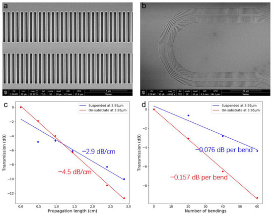 We experimentally investigated the propagation loss and bending loss of the suspended waveguide with SWG claddings. A sub-wavelength grating coupler design operating around a wavelength of 3.95 μm is adopted for the light in and out of the chip [52]. The waveguide devices were measured before and after DHF removal, which are denoted as on-substrate and suspended devices, respectively. The cut-back method was used to determine the waveguide loss. For the propagation loss, the transmission measurements on several propagation lengths from 0.6 cm and 3.48 cm at the wavelength of 3.95 μm were used for analysis. Similarly, the bending loss was determined with the transmission measurements on a varying number of bendings (20 μm radius) from 20 to 80 at a wavelength of 3.95 μm. As result, the propagation loss could be reduced from −4.5 dB/cm to −2.9 dB/cm with the removal of the BOX layer (Figure 5c), and the bending loss could be reduced from −0.157 dB each to −0.076 dB each (Figure 5d). It can be found that the waveguide loss could be greatly reduced after the BOX removal. This can be attributed to the elimination of oxide absorption loss. In addition, the suspended waveguide structure also offers more symmetric mode confinement compared with the on-substrate one. The reported waveguide loss is comparable to the study in [47].