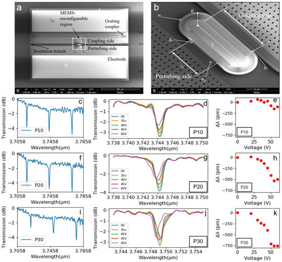 We experimentally implemented the concept of the reconfigurable ring resonator discussed in Section 2. As shown in Figure 7a, the experimental device consisted of the coupling side, the perturbing side, and the race-track ring resonator in the middle. At the coupling side, the bus waveguide was attached to the cantilever-shaped Si slab with single-side SWG claddings to enable light coupling with the ring resonator. At the perturbing side, a narrow Si beam was attached to the movable MEMS cantilever to perturb the evanescent field of the ring resonator waveguide. With the insulation trenches, the movable cantilevers on the coupling and perturbing sides could be electrically separated and had individual electrical potentials. In this study, we only investigated the mode perturbation. Thus, the electrode on the coupling side and the Si substrate were grounded. Meanwhile, the bias voltage was applied on the perturbing side to offer the electrostatic force for vertically downward actuation. Design parameters are denoted in Figure 7b. Specifically, wr = 1.3 μm, Rr = 10 μm, lr = lc = 30 μm, the gap on the coupling side gc = 400 nm, the gap on the perturbing side gp= 260 nm, the perturbation beam width wp = 600 nm. The round-trip length of the racetrack ring resonator was around 123 μm to meet our design target. The bus waveguide on the coupling side was tapered from 1.4 μm to 1.3 μm to enhance the coupling. The width of the perturbation beam was designed to be the mode cut-off condition. Thus, there mode coupling was not induced on the perturbing side. The suspended MEMS cantilever length on the perturbing side was designed to be 30 μm, and the pull-in voltage could be estimated to be 75 V [50]. Three devices with varying perturbation beam lengths, 10 μm, 20 μm and 30 μm, were investigated and subsequently denoted as P10, P20 and P30, respectively.