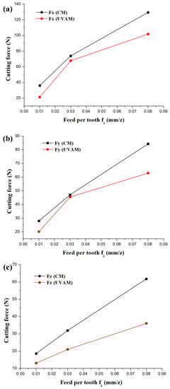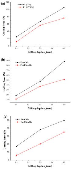 - Compared with the CM method, the UVAM method can effectively decrease the cutting force even under dry milling, and when the selected value of fz and ap ranged from low to high, respectively, the corresponding cutting force of UVAM was reduced by up to 0.8–42% and 5.3–65%, respectively.