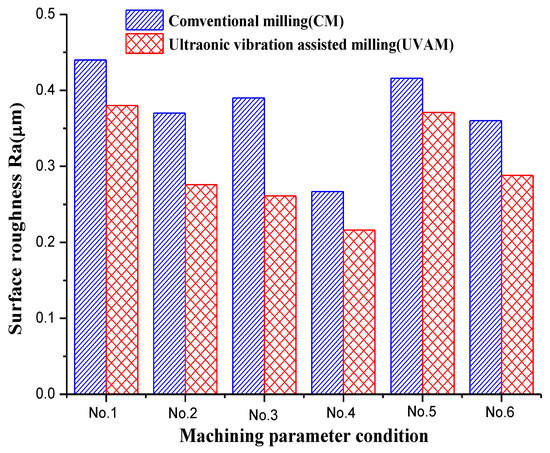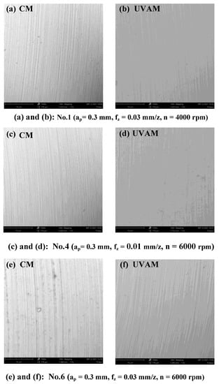 - Compared to CM, UVAM can effectively reduce surface roughness, Ra, and the surface roughness can be reduced by 10.82–37.97% under the cutting condition of this study. The results demonstrate that UVAM is superior to CM in improving surface quality even under the dry milling condition.