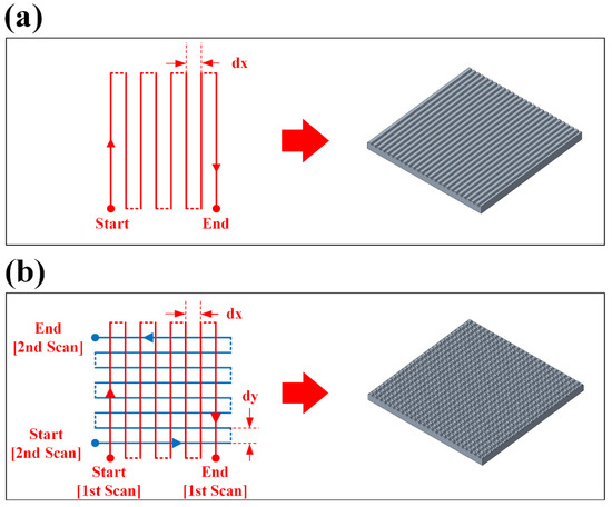 Figure 1. Pattern designs used for laser surface texturing of BMG: (a) unidirectional; (b) cross-hatch.