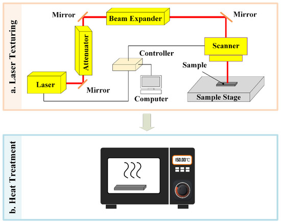 The laser-based surface texturing experiment mainly consists of two steps: (1) laser surface texturing and (2) heat treatment. Laser surface texturing experiments employed a laser marking machine (TH-UV200A, Tianhong Laser, Suzhou, China) equipped with a 355 nm UV laser source (AWAVE 355-15W-30K, Advanced Optowave, Ronkonkoma, NY, USA). The laser source emits a laser beam guided by reflective mirrors. The intensity of laser power is controlled by the attenuator, and the diameter of the laser beam can be expanded by the beam expander. The focusing lens of the system provides a focal spot diameter of ~35 µm during the laser texturing experiments. Unidirectional line pattern and cross-hatch pattern were used due to the ease and high efficiency of fabrication, as shown in Figure 1a,b. A series of preliminary experimental trials was attempted, and the optimal laser processing parameters were determined and utilized in this work, which can be found in Table 1. The schematics for the laser surface texturing experiments are shown in Figure 2a.