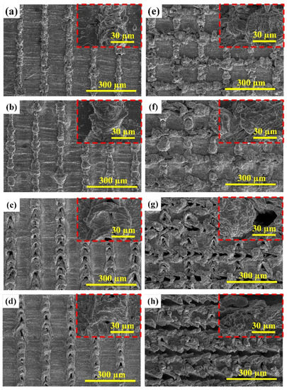 Figure 3. SEM micrographs of the laser textured BMG surfaces using different scanning speeds: (ad) unidirectional surface patterns with the scanning speeds of 20 mm/s, 40 mm/s, 60 mm/s, and 80 mm/s; (eh) cross-hatch surface patterns with the scanning speeds of 20 mm/s, 40 mm/s, 60 mm/s, and 80 mm/s.