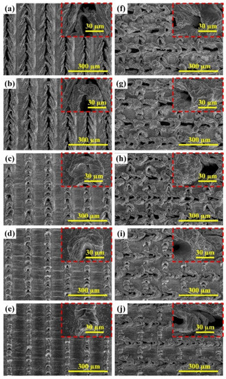Figure 4. SEM micrographs of the laser textured BMG surfaces using different powers: (ae) unidirectional surface patterns with the laser powers of 15.0 W, 13.5 W, 12.0 W, 10.5 W, and 9.0 W; (fj) cross-hatch surface patterns with the laser powers of 15.0 W, 13.5 W, 12.0 W, 10.5 W, and 9.0 W.