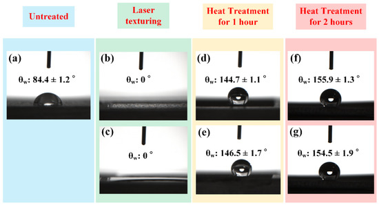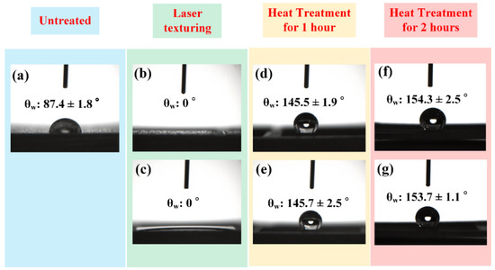 Figure 6. Contact angle measurement results for (a) untreated BMG surface; (b) laser textured BMG surface using the power of 10.5 W, the repetition rate of 30 kHz, the scanning speed of 60 mm/s, and a unidirectional surface pattern; (c) laser textured BMG surface using the power of 12 W, the repetition rate of 30 kHz, the scanning speed of 40 mm/s, and a cross-hatch surface pattern; (d,e) laser textured BMG surfaces in (b,c) after heat treatment for 1 h; (f,g) laser textured BMG surfaces in (b,c) after heat treatment for 2 h.