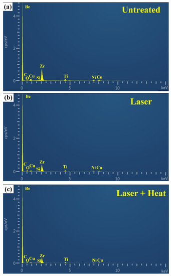 The EDAX mapping data were also obtained to reveal the elemental distribution of all the core elements (Zr, Ti, Be, Cu, Ni, Si, C, and O) on each surface, as shown in Figure 8. From EDAX mapping, it can be clearly observed that all the core elements were uniformly distributed on the untreated surface. For the laser textured surfaces, more black areas can be observed, suggesting a reduction of the Zr, Ti, Be, Cu, and Ni elements, corresponding to the material removal during laser surface texturing. Distinct increases for the amount of O can be seen on the EDAX mapping as well, which strongly supports the oxidation during laser surface texturing. For the elemental distribution of C and Si, no clear change can be observed, which will be further examined using XPS.