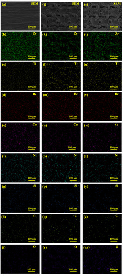 Figure 8. SEM/EDAX element mapping for (ai) untreated BMG surface; (jr) laser textured BMG surface; (saa) laser textured BMG surface followed by heat treatment. (a,j,s) are SEM micrographs representing the corresponding analyzed regions; (bi,kr,taa) are the EDAX maps showing the qualitative elemental distributions of Zr, Ti, Be, Cu, Ni, Si, C, and O.