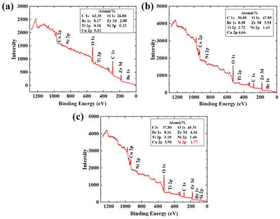 Figure 9. XPS full spectra of (a) untreated BMG surface; (b) laser textured BMG surface; (c) laser textured BMG surface followed by heat treatment.