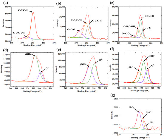 Figure 10. The high-resolution core elemental spectra of carbon on (a) untreated BMG surface; (b) laser textured BMG surface; (c) laser textured BMG surface followed by heat treatment. The high-resolution core elemental spectra of oxygen on (d) untreated BMG surface; (e) laser textured BMG surface; (f) laser textured BMG surface followed by heat treatment; and (g) the high-resolution core elemental spectra of silicon on the laser textured BMG surface followed by heat treatment.