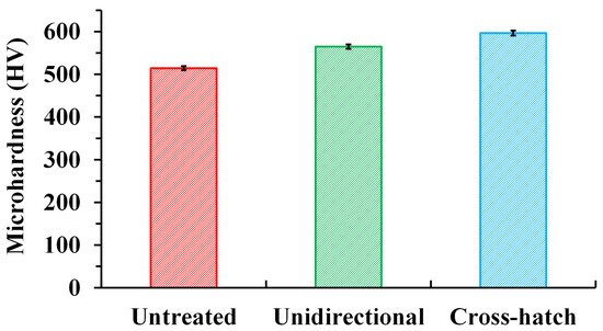 Figure 11. Microhardness measurements for untreated surface, laser textured BMG surface with unidirectional pattern, and laser textured BMG surface with cross-hatch pattern.