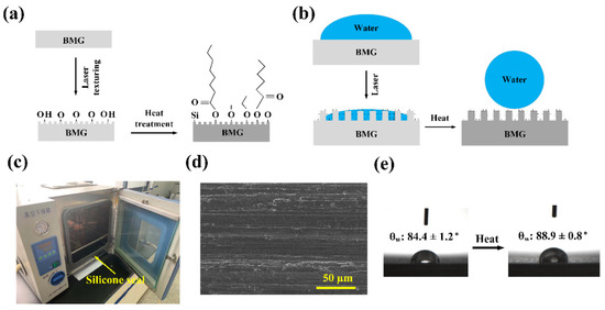 Figure 12. Schematic for the mechanism of wettability transition for the laser textured BMG surface after laser texturing and heat treatment: (a) alteration of surface chemistry; (b) alteration of surface wettability; (c) demonstration of the silicone seal on the furnace used in this work; (d) SEM micrograph of the untreated BMG surface; (e) contact angle measurement results for the untreated BMG surface before and after heat treatment.