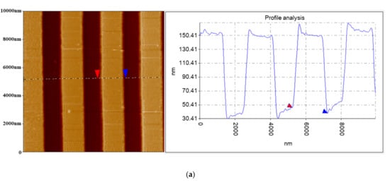 The probe was applied in a PFM to scan the calibration grating (tipsnano, Tallinn, Estonia). As shown in Figure 9, the fabricated conductive probes achieved good imaging resolution comparable to that of the commercial probes. The probe was also used to scan the LiNbO3 single-crystalline samples with a scanning area of 5.5 μm × 5.5 μm. The 1000th scanning image was compared with the 1st scanning image, as shown in Figure 10. After 1000 scans, the fabricated conductive probe still had good conductivity, indicating that the fabricated conductive probe with the PtSi probe had good wear resistance.