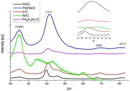Figure 1 shows the XRD patterns of PdIrNi/C, Pd4Ir2Ni1/C, Pd/C, Ni/C, and Ir/C. The broad peak at ~25° is attributed to the semi-crystalline nature of graphitic vulcan carbon. The basal C (002) peak is broader than the other metallic peaks in Pd/C, Ir/C, Pd4Ir2Ni1/C and PdIrNi/C. However, it is more intense in the case of Ni/C, probably because small-size oxidized Ni species are the main constituent, but the peak at approximately 43° seems to represent the fcc metallic Ni peak of (111) according to [,]. The other peaks of Ni/C at ~35°, and ~60° are attributed to nickel hydroxide species according to the same references. Considering the Pd/C pattern, this shows another three peaks located at approximately 40°, 46°, 67.8°, and 82.3° ascribed to the Pd polycrystalline phases of Pd (111), Pd (200), Pd (220), and Pd (311), respectively. Similar peaks to those exist—but positively shifted 1° in the case of Ir/C—due to the smaller crystal lattice size and atomic radius of Ir compared to Pd.