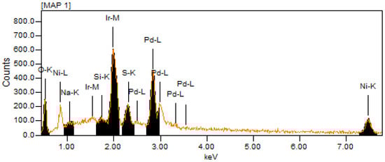 Figure 2 shows the EDX elemental spectrum of PdIrNi at 20 kV. The predominantly high C–K peak is not shown in order not to suppress the other metallic ones. The peaks of Ir–M, Pd–L, and Ni–K are all visible in the spectrum. The Na, S, and Si peaks could be ascribed to the Vulcan carbon impurities. The O–K one is probably due to either the carbon functional groups or Ni oxide species. It is noteworthy that Ni concentration at 10 kV is almost twice its concentration at 20 kV for both trimetallic samples; a trend that is not noted for both Pd and Ir. This finding is crucial because it proves the high surface segregation potential of Ni [,]. Another important observation from Table 3 is that both Pd and Ir concentrations in both samples measured at 10 kV are higher than those at 20 kV, but the Ir increase is higher than that of Pd which shows the Ir’s higher tendency of surface segregation. Figure 3 shows the EDX elemental maps of PdIrNi/C and Pd4Ir2Ni1/C recorded at 20 kV. The Ir and Pd maps of PdIrNi/C (Figure 3A,B) show more densely populated samples as compared to Ni (Figure 3C). The less dense population of Ni map is due to the lower atomic Ni concentration detected compared to Pd and Ir (Table 3) even though the nominal added quantities of the three metals are equivalent. This is probably because Ni tends to segregate to a higher surface level above the EDX electron beam interaction volume which is supported by the significant XPS surface concentration (Table 4) of Ni (1.25 at.%) that is higher than Pd (1.21 at.%) but lower than that of Ir (1.48 at.%). A similar trend could be observed for Pd4Ir2Ni1/C sample (Figure 3D,E,G).