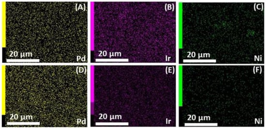 EDX Pd, Ir, and Ni maps of PdIrNi/C (A–C) and Pd4Ir2Ni1/C (D–F).