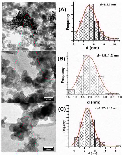 To study the nanocatalyst surface morphology, transmission electron microscopy (TEM) was performed. Figure 4 shows the micrographs and particle size distribution of Pd/C (A), PdIrNi/C (B) and Pd4Ir2Ni1/C (D). For Pd/C, dispersed metal dark particles (2–10 nm) appear along larger grey carbon aggregates (30–60 nm). Nonetheless, particle agglomeration could be seen for this sample. Intense aggregated particles are visible in the middle area but this is, probably, due to the TEM sample preparation and not something inherent in the Pd/C powder. The particle size distribution of that sample shows the average particle size (of approximately 100 particles) equals 5 nm which is close to but larger than the XRD size (Table 2). Figure 4B shows the micrograph and particle size distribution of PdIrNi/C which shows enhanced particle dispersion compared to Pd/C (Figure 4A). The average particle size of PdIrNi is 1.9 nm which is 3.1 nm smaller than Pd. Likewise, the particle size of Pd4Ir2Ni1 (Figure 4C) equals 2.3 nm which is 2.7 nm less than Pd but 0.4 nm larger than PdIrNi. The TEM analysis showed significant particle size reduction in the trimetallic samples compared to Pd/C. This is a usual finding when preparing bimetallic and trimetallic supported nanoparticles due to difference in metal chemistries [,,]. Another reason for the trimetallic particle size decrease of PdIrNi is that since the geometrical parameters of Ir and Ni are smaller than those of Pd, they are likely to be incorporated into the latter’s lattice exercising compressive stress and strain causing a net lattice contraction. As shown in Figure 1, adding Ir to Pd shifts its diffraction angles to higher values and exercise compressive strain on it. The increase of particle size of Pd4Ir2Ni1 compared to PdIrNi is, probably, due to the decreased proportion of Ni and Ir and increased one of Pd in the former since the overall metal load is unchanged.