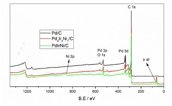 XPS full surveys of Pd/C, Pd4Ir2Ni1/C, and PdIrNi/C.