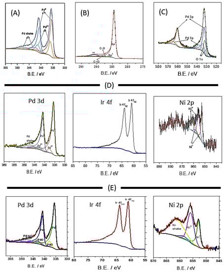 XPS peaks of Pd 3d (A), C 1s (B), Pd 3p + O 1s (C) in Pd/C, peaks of Pd 3d, Ni 2p, Ir 4f of Pd4Ir2Ni1/C (D) and PdIrNi/C (E).