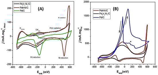 Figure 7A shows the cyclic voltammetry (CV) graphs of Pd/C, Pd4Ir2Ni1/C and PdIrNi/C in 1 M KOH recorded at 50 mV/s. The voltammogram of Pd/C is typical of other Pd ones reported [,,,]. The H adsorption/absorption is more pronounced on the trimetallic samples while it is largely suppressed on the Pd/C due to the capacity of Pd to absorb hydrogen into its core structure instead of undergoing surface reaction. Considering PdIrNi and Pd4Ir2Ni1, Ir behaves similarly to Pt since it adsorbs H on its surface [,]. Therefore, the higher current noted around −600 mV is ascribed to that process. Upon increasing the applied potential further, OH adsorption commences around −300 mV. It is noteworthy that Pd/C shows enhanced adsorption compared to the trimetallic samples, probably due to the lower capability of Ir and Ni to adsorb OH []. The OH adsorption is, technically, the onset of surface oxidation but it continues until the actual surface oxidation starts around 50 mV, which continues until the end of the forward scan. However, a sharp increase in the current on PdIrNi/C is noted, at the that end, which is due to Ni(OH)2 oxidation to NiOOH which is then reduced back to Ni(OH)2 in the reverse scan around 350 mV []. The Ni(OH)2-associated current increase is much less on Pd4Ir2Ni1/C than that of PdIrNi/C which is probably due to the significantly lower Ni quantity in the former. Similarly, the NiOOH-associate current decrease was noted in the reverse scan on Pd4Ir2Ni1/C for the same reason.
