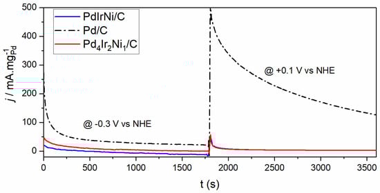 To investigate the catalyst’s EOR stability, 2-step chronoamperometry scan was undertaken on each catalyst (Figure 8). The first constant potential was −0.3 V and was applied for 30 min. The second was +0.1 V and was applied for another 30 min starting immediately after the first step ended. The scans were performed in 1M KOH + C2H5OH. The −0.3 V potential, according to Figure 7, is located in the middle of OH adsorption potential window. Therefore, in Figure 8, a high tolerance for poisoning species is attained by the constant generation of adsorbed OH species that are capable of removing the adsorbed ethoxy. The higher current obtained for Pd/C that is more than the two trimetallic catalysts is probably because of the Pd surface abundance on it. This is further proved by the higher current density of Pd4Ir2Ni1/C than PdIrNi/C because the former’s surface contains Pd more than Ir and Ni combined while the latter’s surface contains equivalent molar concentrations of each metal (Table 3 and Table 4). Also, there is a shift to higher binding energies (approximately +0.1 eV) of Pd 3d according to the XPS (Table 4). Such a shift to a higher binding energy could be a negative indication of lower catalytic performance. A higher bonding strength existing between Pd sites and poisoning species on the trimetallic samples could present higher activation barriers of EOR compared to Pd/C. At −0.1 V, however, the initially remarkable current density, on Pd/C, decays rapidly with the time. The quick current deterioration is probably because of lacking OH species (Figure 6 and Figure 7) on the catalyst surface to remove the poisoning species which leads to permanent losses of Pd active sites. Nonetheless, the trimetallic samples achieve identical CA current densities—which are much less than Pd/C—at +0.1 V. That is once again because of less Pd surface presence. It is, also, noteworthy, that both catalysts achieve identical current density in the voltammogram forward scan (Figure 7) which is probably why they achieve identical CA current densities. However, both of them achieve stable current compared to Pd/C which is due the Ir and Ni potential to generate oxygen species that could remove the ethoxy from Pd active sites.