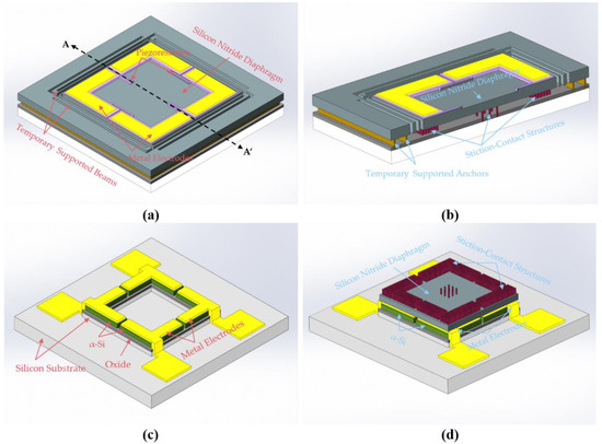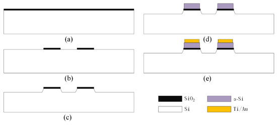 (d) A 1 μm-thick layer of amorphous silicon (α-Si) is deposited by plasma-enhanced chemical vapor deposition (PECVD) for subsequent Au–Si eutectic bonding, as shown in Figure 7d.