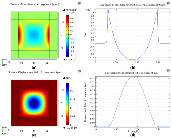 COMSOL simulation results of the stress and displacement of silicon nitride diaphragm caused by stiction effect. (a,b) Maximum stress occurs at the edge of the silicon nitride diaphragm, and its value is approximately 167.71 MPa; (c,d) Maximum displacement occurs at the center of the silicon nitride diaphragm, and its value is approximately 0.69 μm.