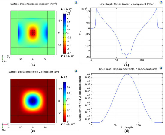 COMSOL simulation results of tactile sensor. (a) Stress simulation of the silicon nitride diaphragm; (b) Stress simulation result shows that the maximum stress occurs at the edge of the silicon nitride diaphragm, and its value is 98.59 MPa; (c) Displacement simulation of the silicon nitride diaphragm; (d) Displacement simulation result shows that the maximum displacement occurs at the center of the silicon nitride diaphragm, and its value is 0.25 μm.