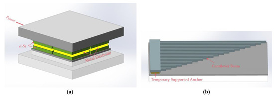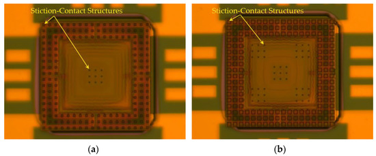 To ensure that the deadhesion process does not damage the bonding strength of the transferred device, the Au–Si eutectic bonding technique was employed to ensure the bonding strength of the subsequent flip-chip bonding process, in which the bonding strength is usually larger than 16 MPa in the laboratory [31]. Moreover, the metal electrode area for Au–Si eutectic bonding is designed to be 12,320 , which is much larger than the designed area of stiction-contact structures, so that the adhesion forces caused by stiction can be negligible compared with the Au–Si eutectic bonding strength.